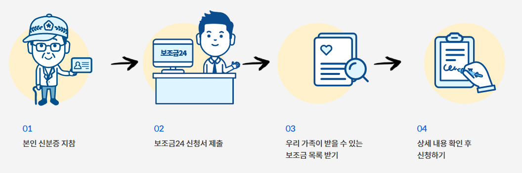 정부24사이트 이용이 어려우신 분들은 가까운 읍면동 주민센터를 이용하시면 됩니다. 신분증을 지참하시고, 가까운 주민센터를 방문하여 보조금24 신청서를 제출하시면 온라인과 동일하게 내가 받을 수 있는 정부 지원 혜택들에 대해 안내 받을 수 있습니다.