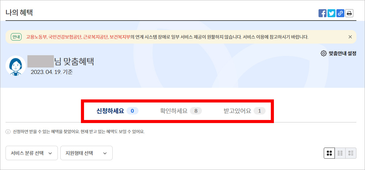 위 그림 빨간색 박스 쳐 놓은것이 나에게 해당되는 검색 결과 입니다. 예를 들어 저의 경우는 '받고있어요' 메뉴에 한개 받고 있는걸로 나오고 있습니다. '확인하세요'는 8개인데 메뉴 클릭하셔서 상세 내용을 읽어보시고, 해당요건에 부합하는지 체크하시면 됩니다.